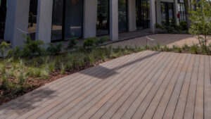 Acompañamos a la construcción del Complejo Bella Vista Plaza, instalando 1200 m2 de nuestros Decks WPC. Además, realizamos un completo sistema de parasoles con madera termotratada.