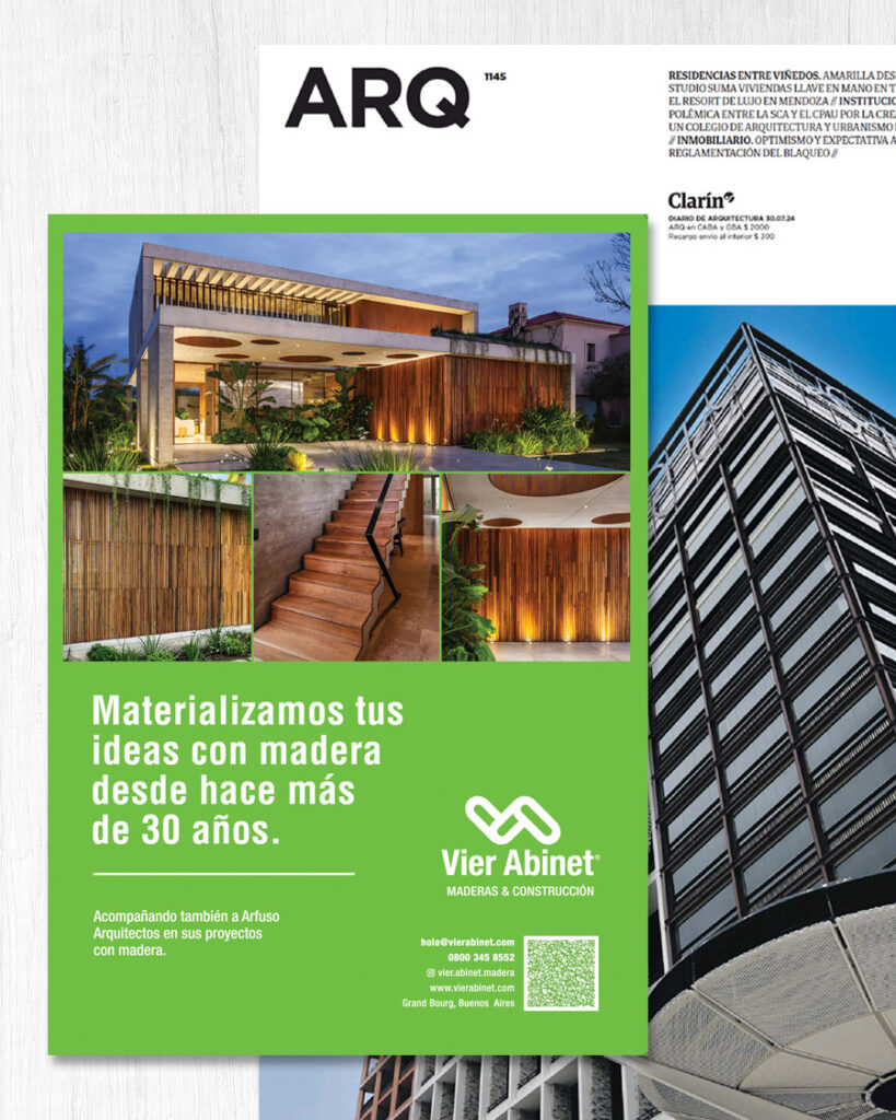 Materializamos tus ideas con madera, y el lanzamiento de nuestra campaña de comunicación inicialmente en la revista de arquitectura Clarín ARQ, publicada el día Martes 30 de Julio 2024. En este caso, acompañando la obra «Muelles 129”, del estudio Arfuso Arquitectos, donde la calidez de nuestros revestimientos de madera fueron nuevamente protagonistas.